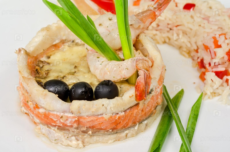 Блюдо из морепродуктов, риса и овощей крупным планом