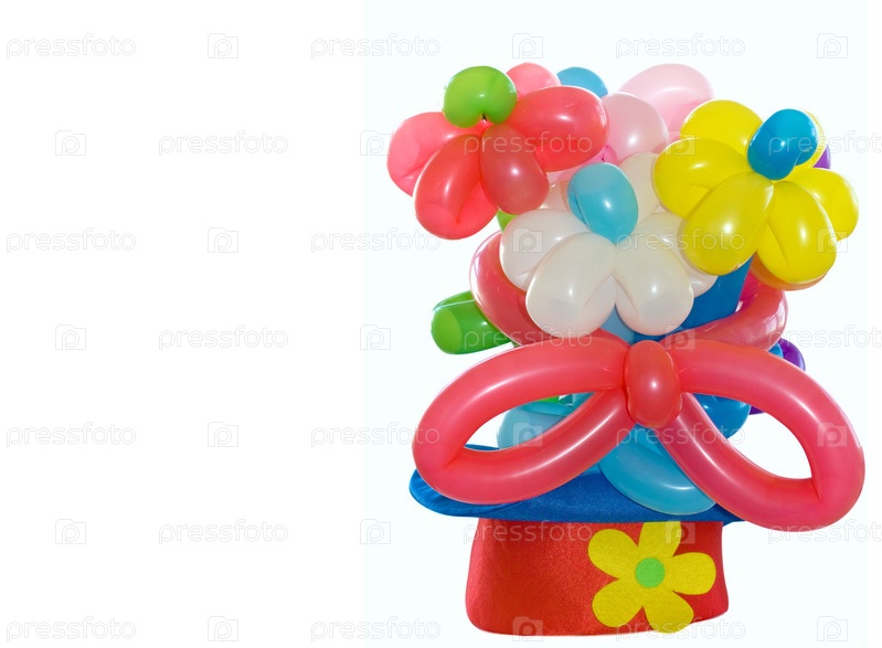 Букет цветов из шариков в клоунской шляпе на белом фоне