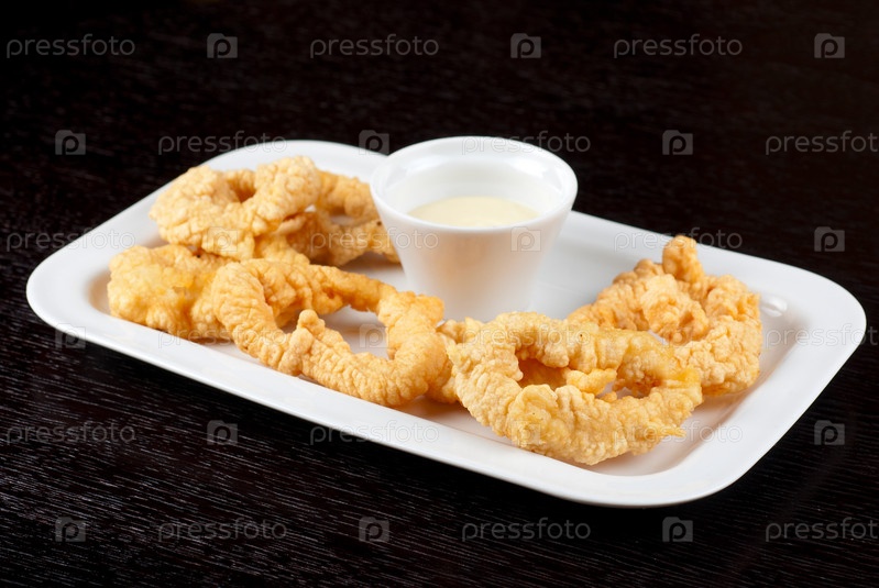 Жареный кальмар с соусом на белом блюде