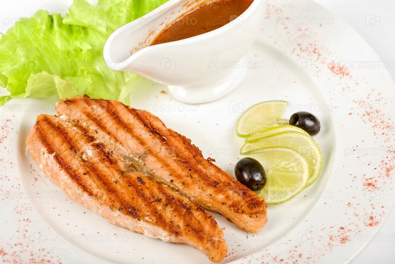 Стейк из форели с соусом, лимоном и зеленью на тарелке