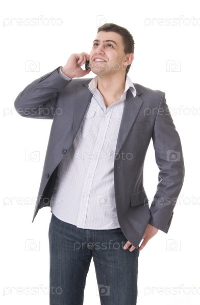 Портрет молодого симпатичного бизнесмена, разговаривающего по телефону