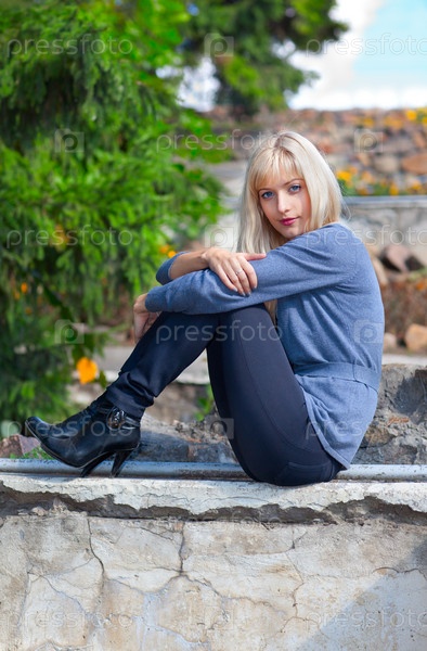 Девушка сидит на каменных ступенях в парке