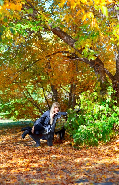 Молодая женщина сидит на скамейке в осеннем парке
