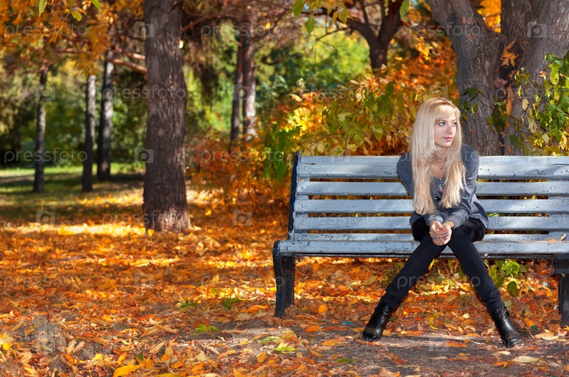 Молодая женщина сидит на скамейке в осеннем парке
