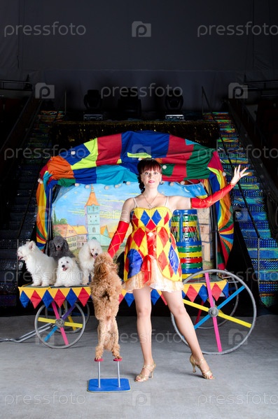Улыбающаяся девушка-клоун показывает трюк "стоячая собака". Ретро-вагон с группой собак на заднем фоне