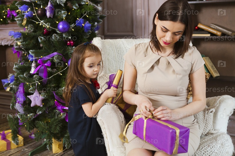 Счастливая мать с дочерью, обертывания рождественских подарков на дому