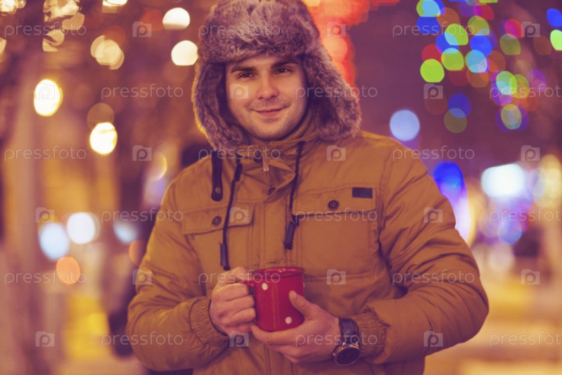 Портрет молодого человека, пить чай, в зимнее время