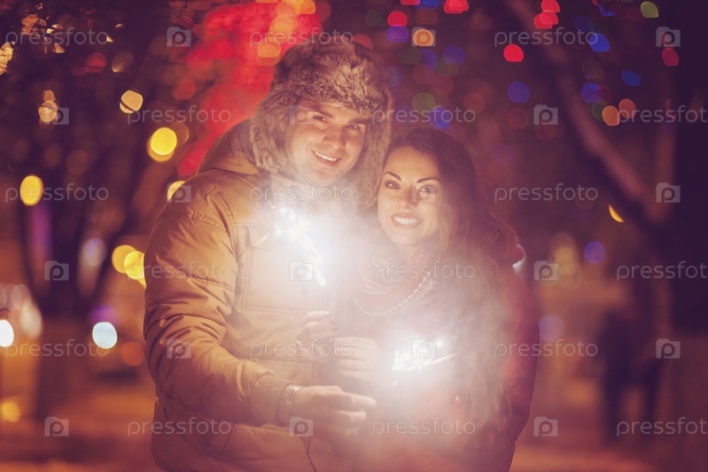 Молодая пара с бенгальский огонь, глядя на камеру