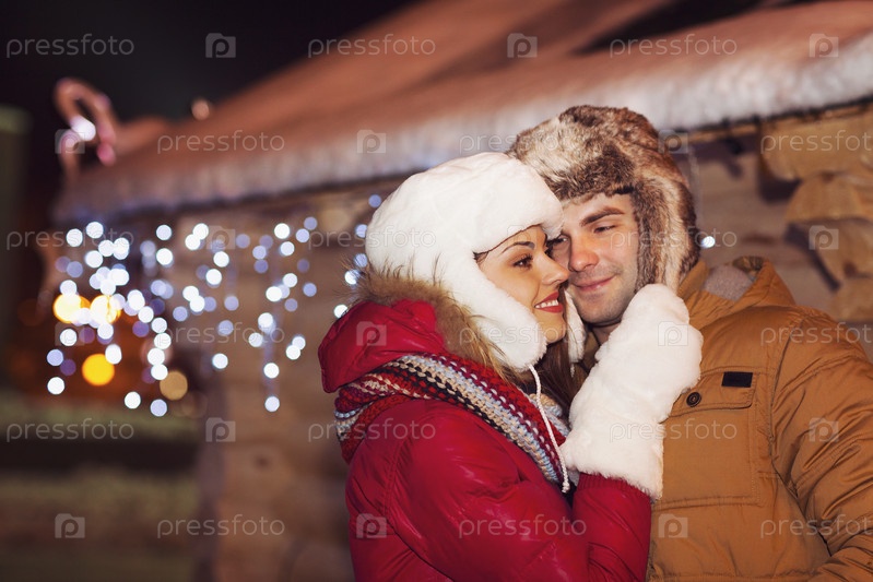 Счастливые пары в любви, вечером Рождественские огни