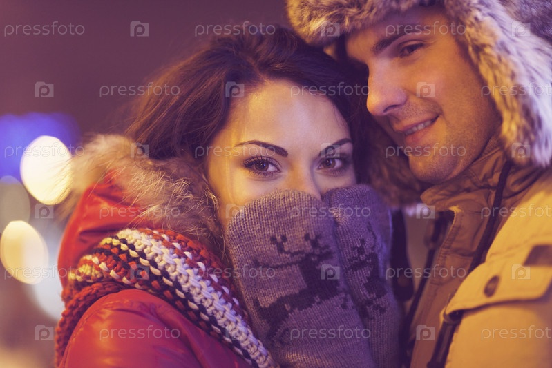 Счастливые пары в любви, вечером Рождественские огни