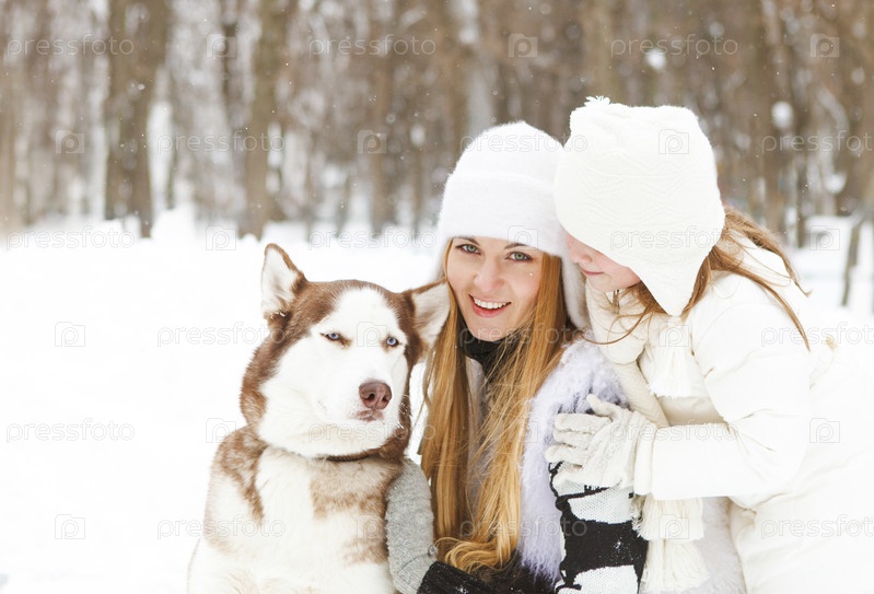 Счастливая мать с дочерью в зимнем парке с хаски собака