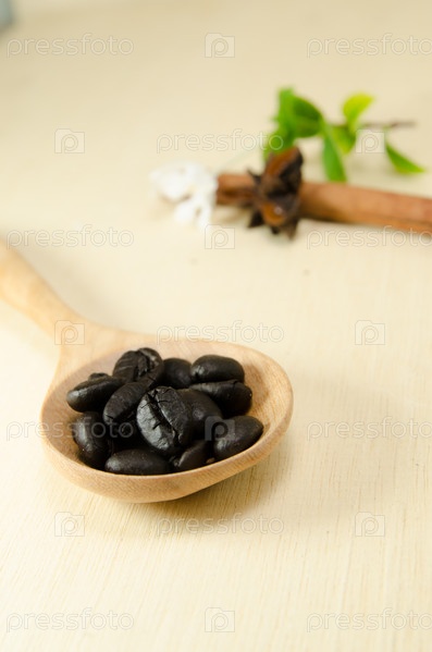 Кофейные зерна в деревянной ложке