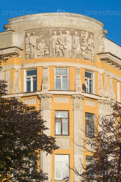 Барельеф советского времени на фасаде здания в городе Саратове у парка "Липки"
