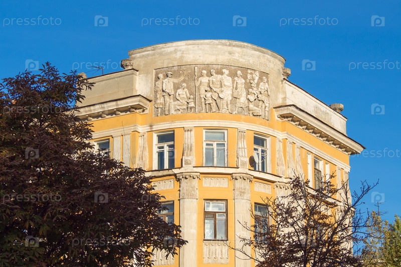 Барельеф советского времени на фасаде здания в городе Саратове у парка "Липки"