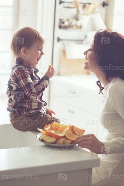 Мать и дитя, едят в кухне