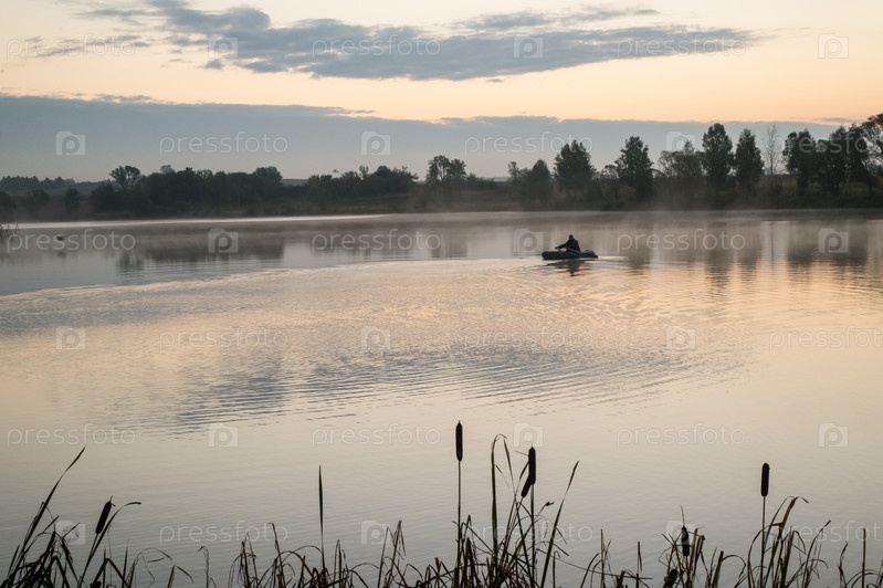 Рыбак в лодке в утреннем тумане