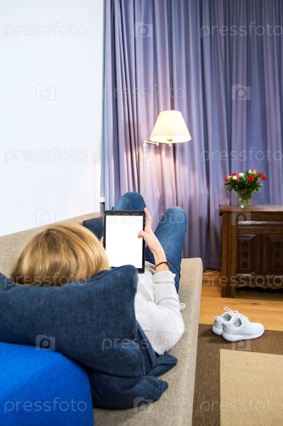 Женщина, расслабиться на диване с планшетом