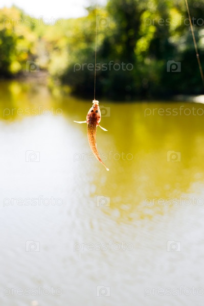 Пойманная рыба висит на спиннинг над водой