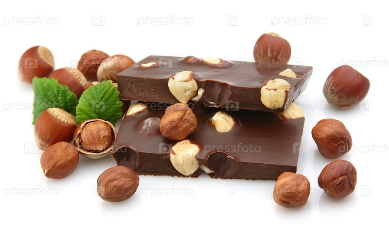 Фундук и два кусочка темного шоколада с цельным фундуком на белом фоне
