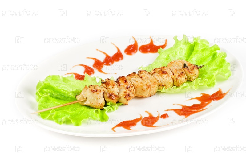 Шашлык из курицы и листья салата, изолированные на белом фоне