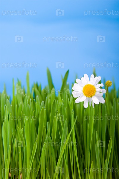 Ромашка и зеленая трава на синем фоне