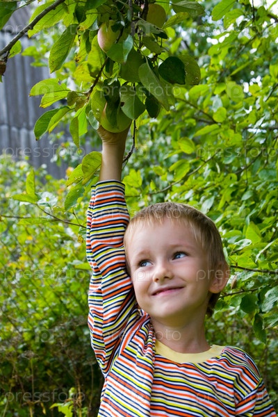 Мальчик собирает урожай яблок в саду