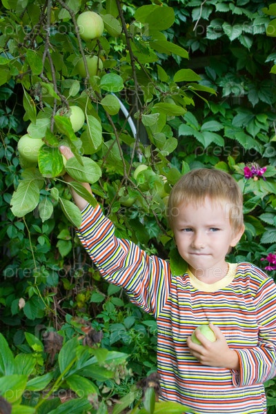 Мальчик собирает урожай яблок в саду