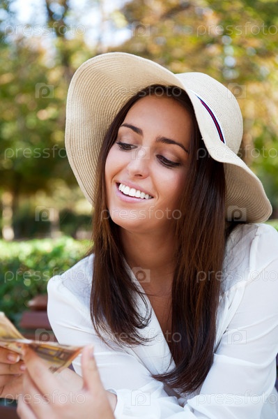 Счастливая женщина в шляпе и белой блузке сидит на скамейке и держит в руках деньги веером