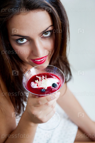 Молодая брюнетка с мороженным глядит на камеру прекрасными глазами