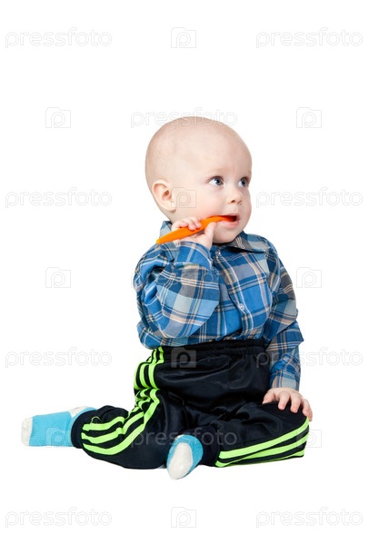 Маленький мальчик с оранжевой ложкой на белом фоне