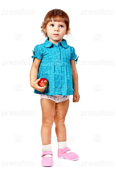 Маленькая девочка с яблоком на белом фоне