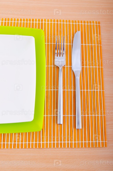 Пустая тарелка, вилка и нож