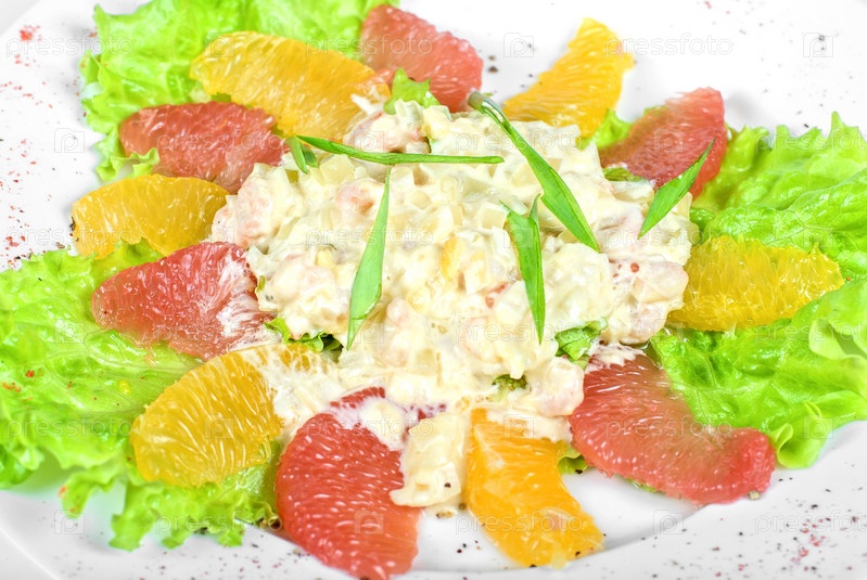 Салат из морепродуктов с цитрусовыми в тарелке
