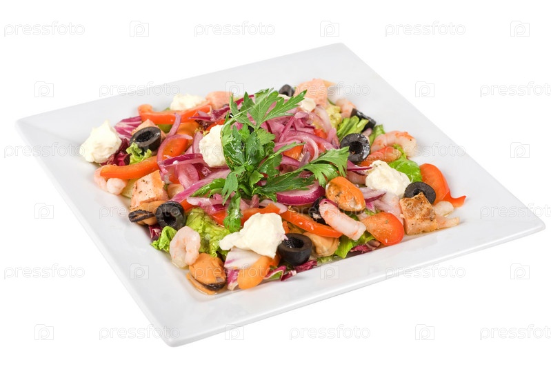 Закуска из морепродуктов и овощей в квадратной тарелке на столе
