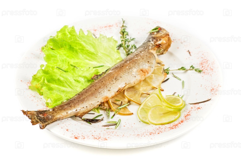 Рыба с лимоном и зеленым салатом в тарелке, белый фон