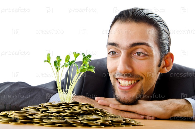 Бизнесмен смотрит, как из кучи золотых монет растут молодые растения