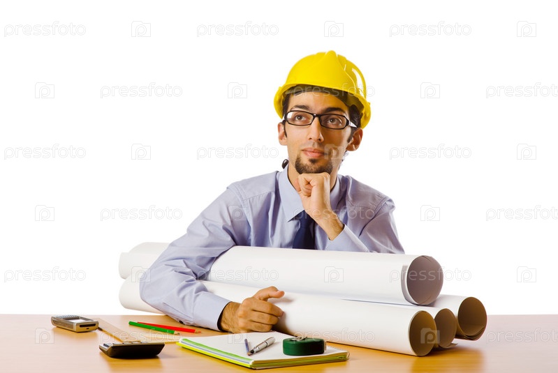 Молодой инженер с чертежами и каской на рабочем месте