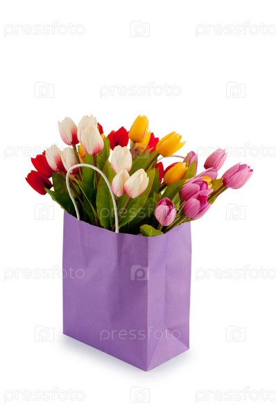 Тюльпаны в бумажном пакете на белом фоне