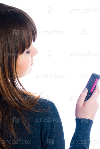 Молодая женщина пишет смс-сообщение, изолирована на белом
