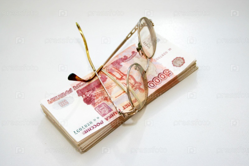 Пачка пятитысячных купюр и очки на белом фоне