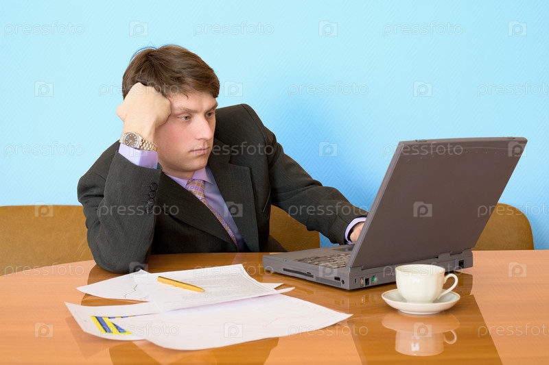 Бизнесмен на рабочем месте с ноутбуком и чашечкой кофе