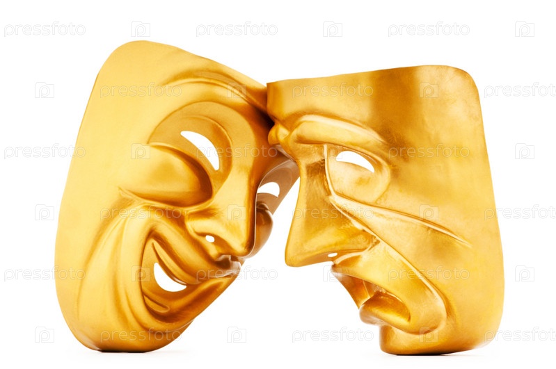 Две золотые театральные маски на белом фоне