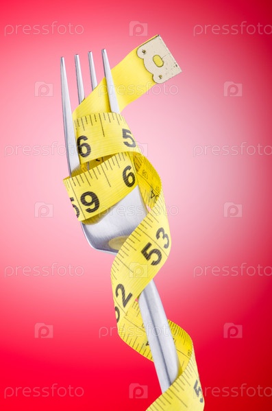 Вилка, нож и сантиметр на красном фоне