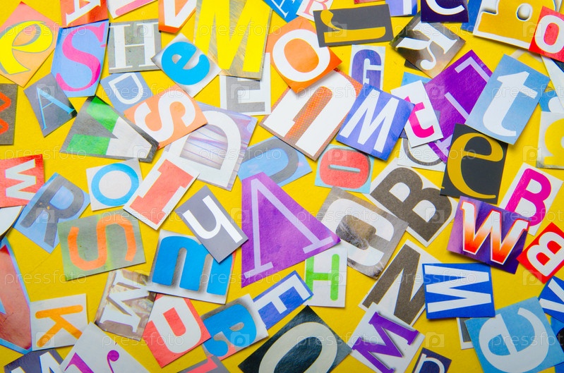 Вырезки из газет с различными буквами крупным планом