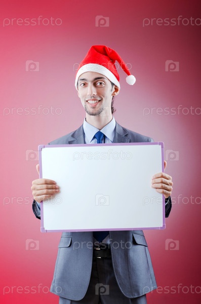 Бизнесмен в новогодней шапке с пустой табличкой