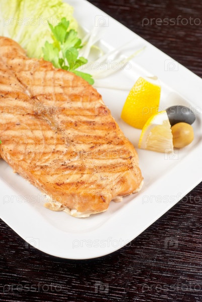 Стейк из лосося с зеленью, луком, лимоном, лаймом и оливками