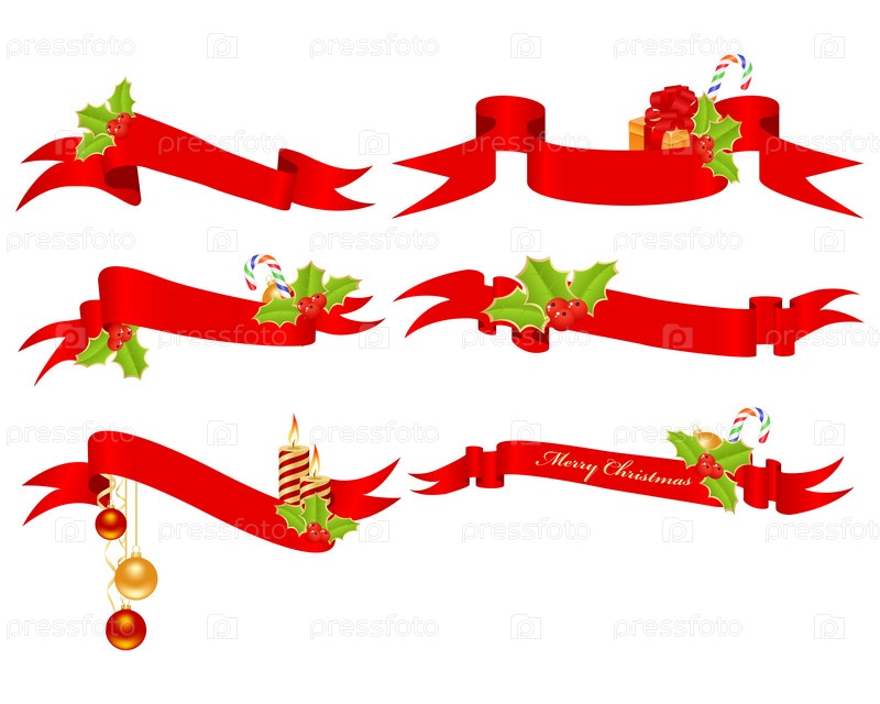 Набор красных ленточек с рождественскими украшениями. Векторные иллюстрации