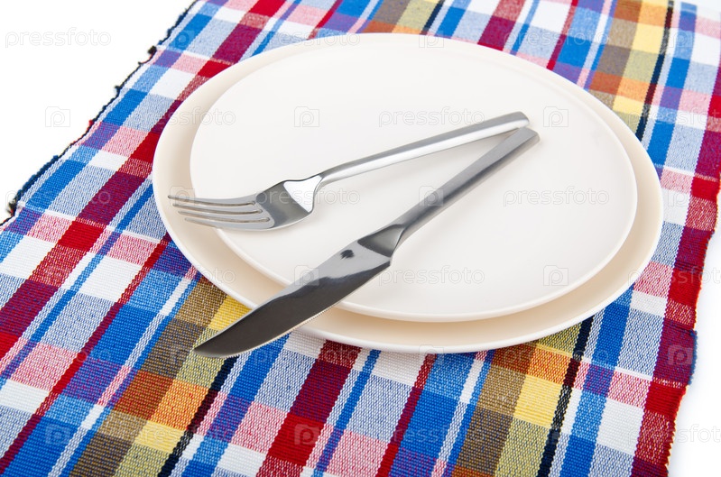 Тарелки, вилка и нож на столе