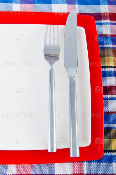 Тарелки, вилка и нож на столе