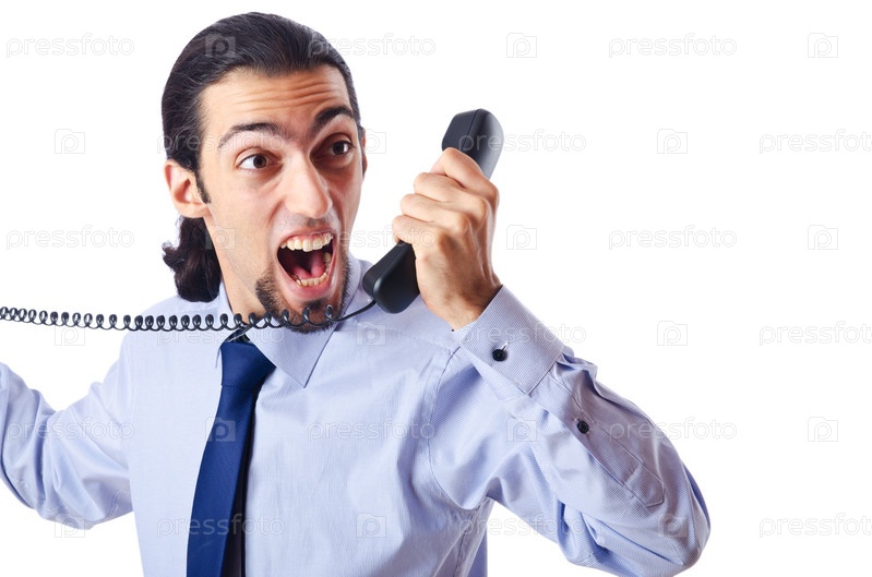 Раздраженный бизнесмен с телефоном на белом фоне